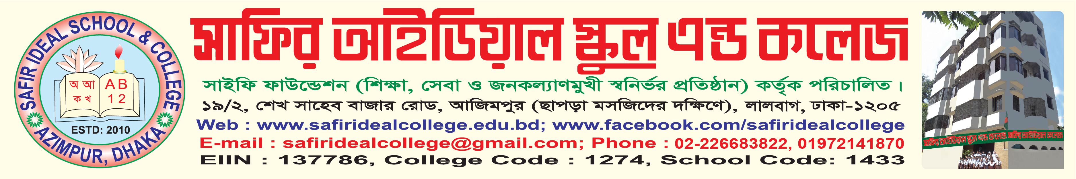 সাফির আইডিয়াল স্কুল এন্ড কলেজ প্রতিষ্ঠিত হয় আধুনিক, নৈতিক ও মানসম্মত শিক্ষার আদর্শ নিয়ে। প্রতিষ্ঠার পর থেকেই প্রতিষ্ঠানটি শিক্ষার্থীদের চরিত্র গঠন, সৃজনশীল চিন্তা ও একাডেমিক উৎকর্ষতার ওপর গুরুত্ব দিয়ে আসছে। শহরের কেন্দ্রস্থলে অবস্থিত হওয়ায় এটি অভিভাবক ও শিক্ষার্থীদের কাছে দ্রুতই একটি বিশ্বস্ত শিক্ষাপ্রতিষ্ঠান হিসেবে পরিচিতি লাভ করে। অভিজ্ঞ শিক্ষকবৃন্দ, আধুনিক পাঠদান পদ্ধতি এবং শিক্ষাবান্ধব পরিবেশের মাধ্যমে প্রতিষ্ঠানটি শিক্ষার গুণগত মান উন্নয়নে কাজ করে যাচ্ছে। সাফির আইডিয়াল স্কুল এন্ড কলেজ ভবিষ্যত প্রজন্মকে দক্ষ ও দায়িত্বশীল নাগরিক হিসেবে গড়ে তোলার লক্ষ্যে অগ্রসর হচ্ছে।.....